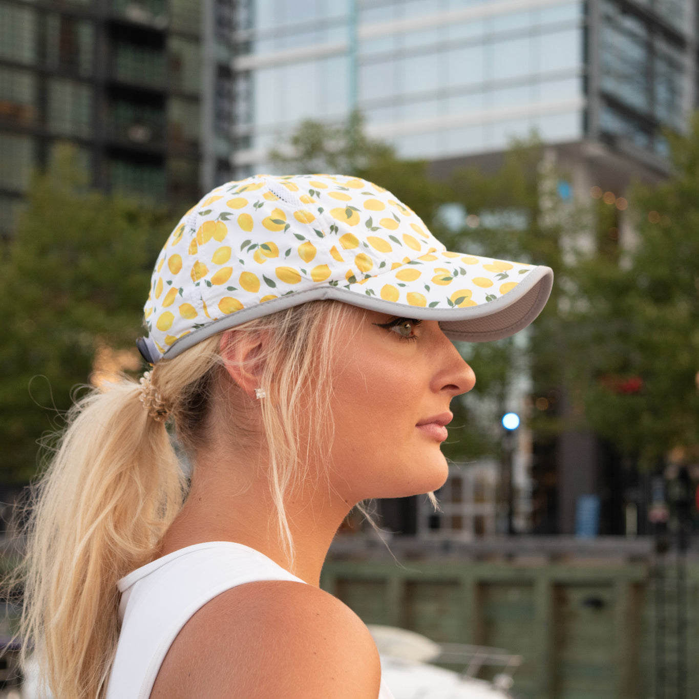 The perfect lemon print meets our sporty feminine baseball cap. Our hand-painted yellow lemon pops and pairs like a neutral. Smooth grey piping. Ultra soft, lightweight and breathable fabric. Modern and snug fit with adjustable velcro strap and branded back pull. White mesh ventilation panels. Grey underbrim. White branded inner.